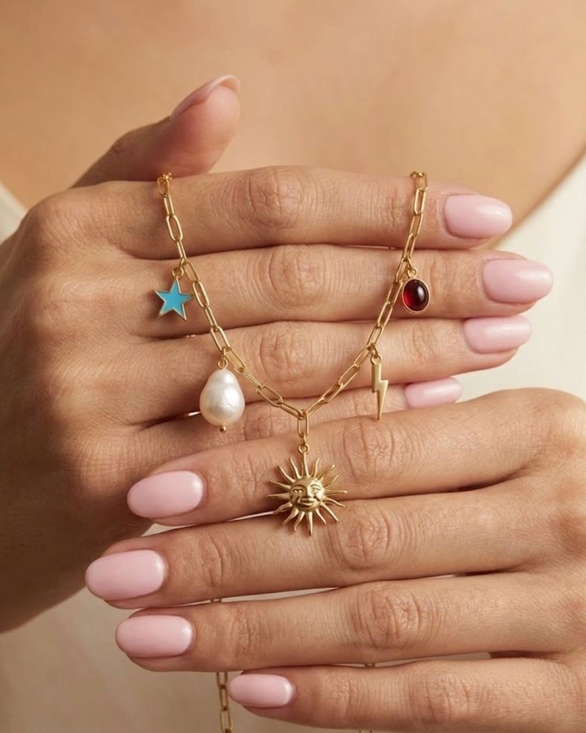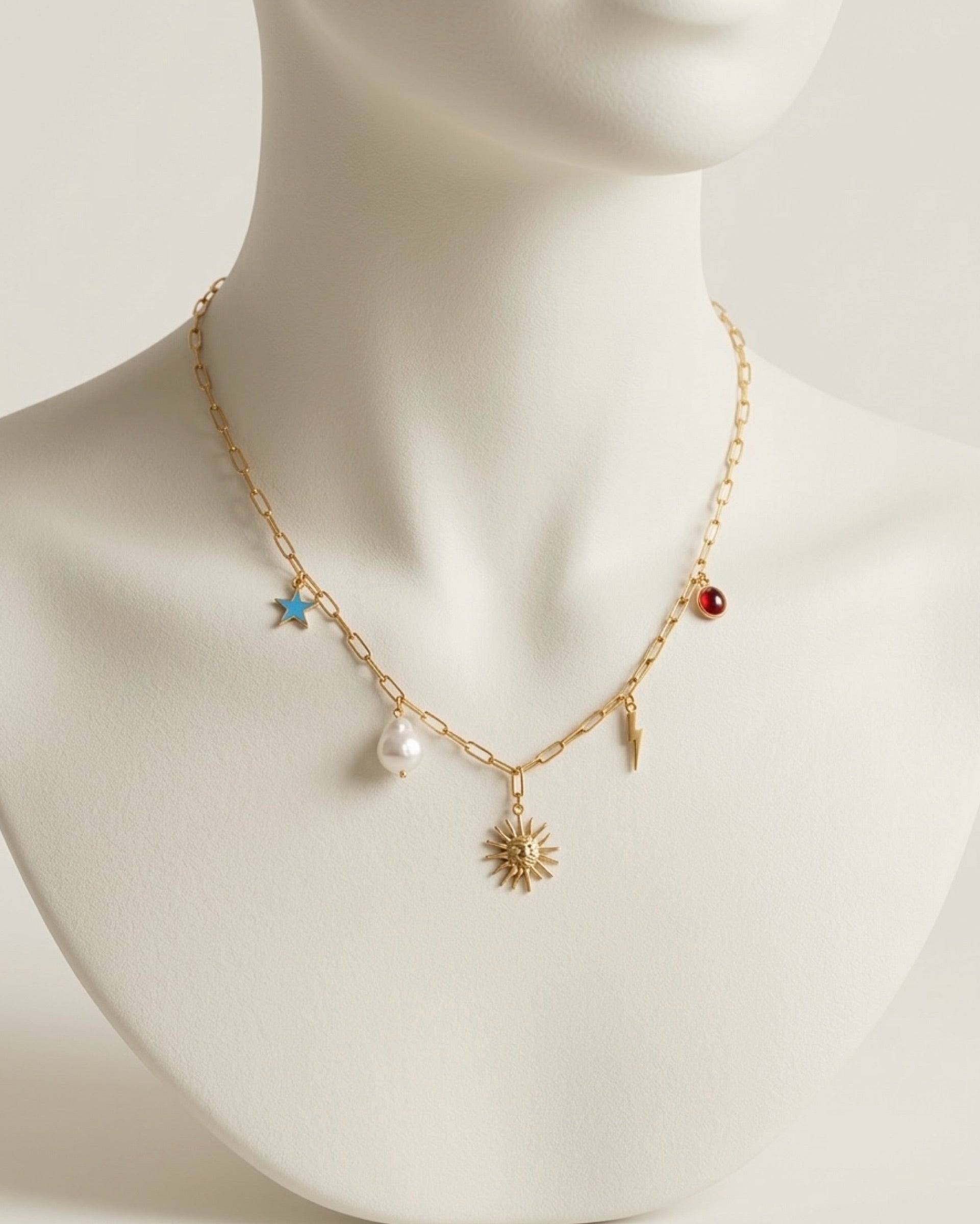 Celestial-inspired gold-plated necklace featuring a stunning collection of whimsical charms perfect for beach parties and summer adventures. The design showcases a radiant sunburst pendant as the centerpiece, complemented by a lustrous baroque pearl, a sparkling blue star, a striking lightning bolt, and a vibrant red gemstone drop. Each charm tells a story of cosmic wonder and playful elegance. Crafted from premium stainless steel, this necklace is skin-friendly, anti-tarnish, and water-resistant—ideal for poolside gatherings and seaside getaways. The gold plating adds a luxurious touch that catches the light beautifully. A must-have accessory for anyone looking to make a statement at their next beach party or summer celebration.