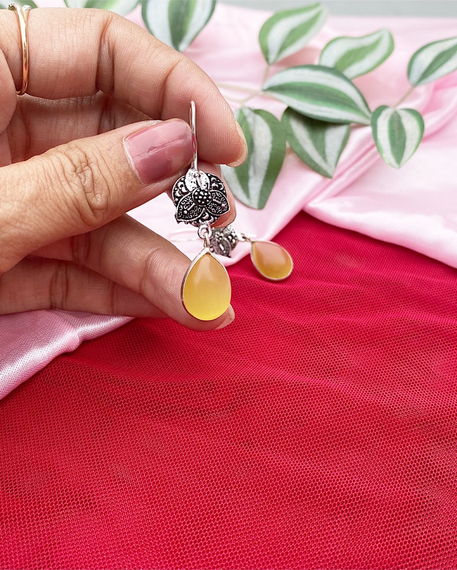 This Yellow Monalisa Stone Dangler is a perfect accessory for daily wear and office wear. Crafted with Monalisa stone, its delicate design adds an elegant touch. Buy now for a stunning look!